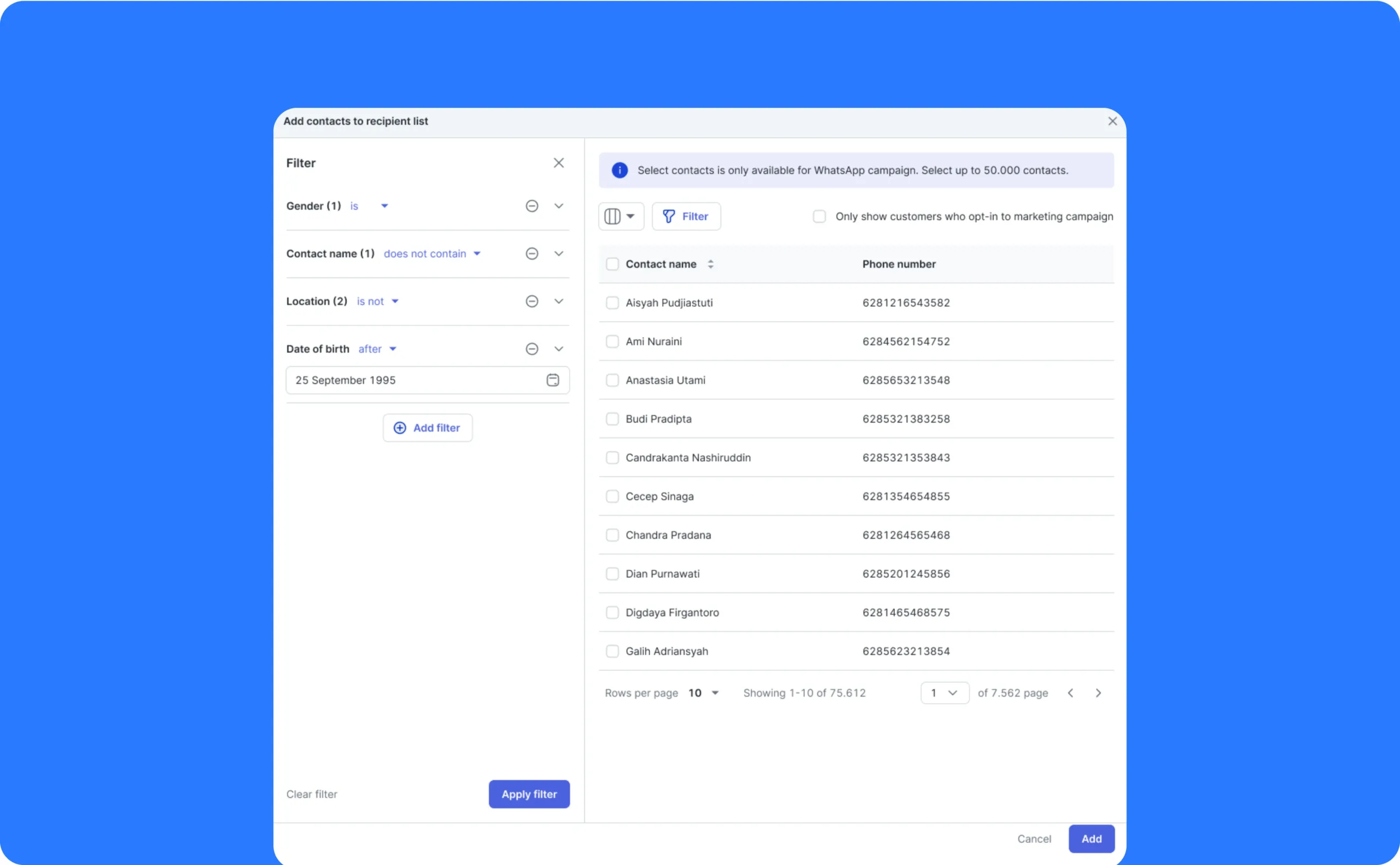- Direkomendasikan untuk campaign dengan volume besar (ribuan kontak).